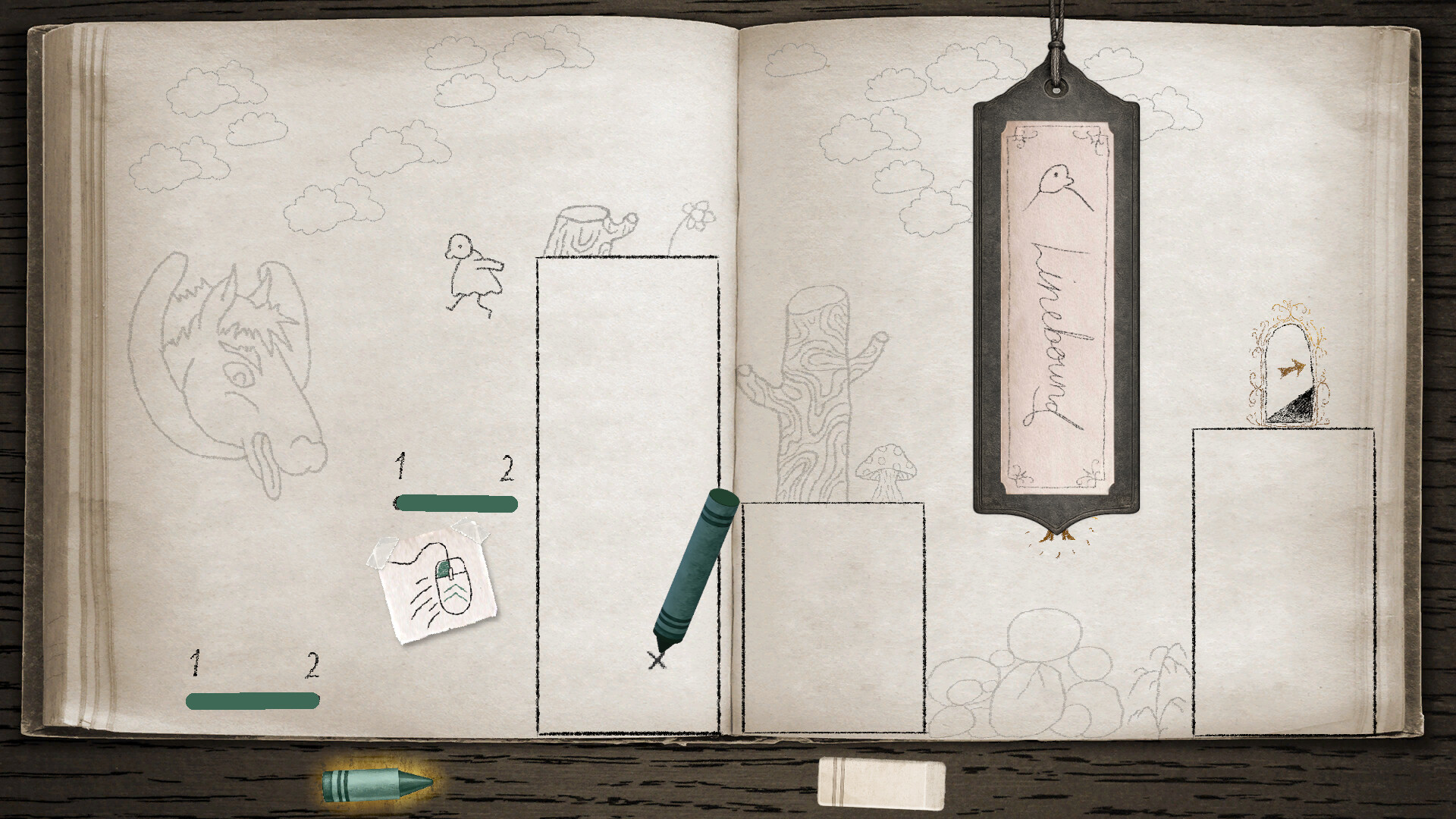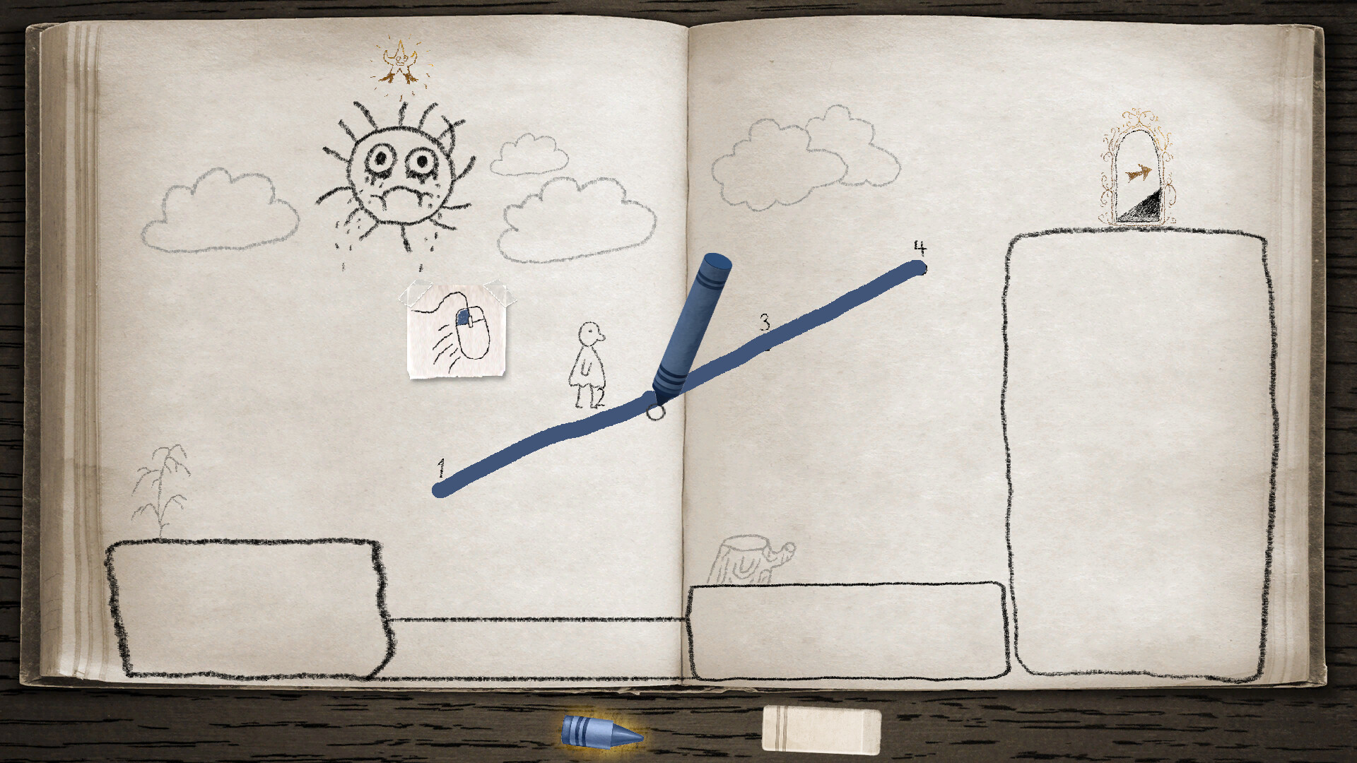 - Hand-drawn art style with pencil characters and crayon environments
