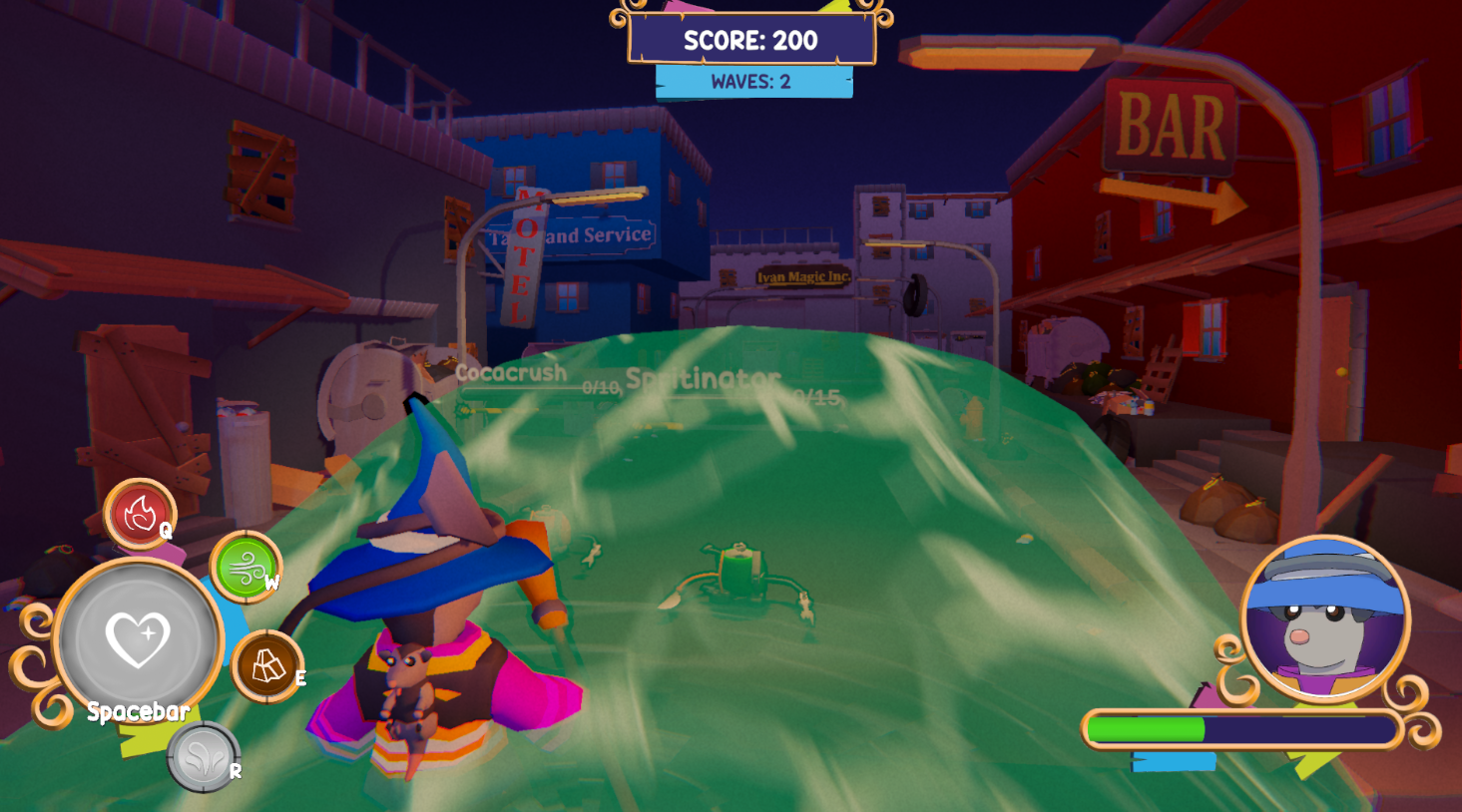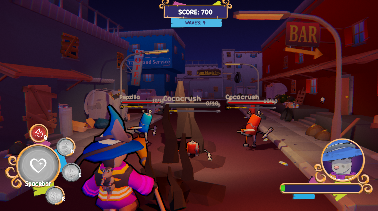 You are the Wastemancer, a magical possum fighting trash! Using only the arrow keys to cast elemental attacks—fire, water, wind, and earth—to defeat waves of unrecycled monsters in a fast-paced, high scoring arcade game.